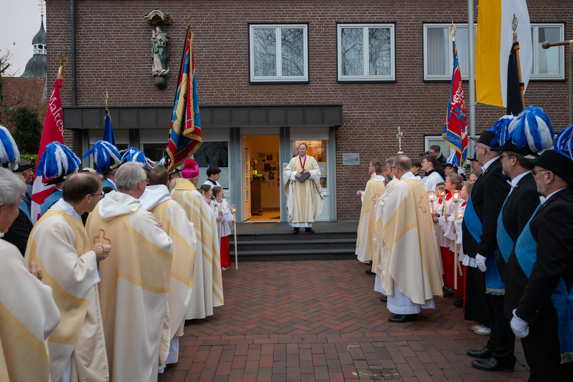 In einem feierlichen Gottesdienst hat unsere Kirchengemeinde am Sonntag, dem 23. November 2025, ihren neuen leitenden Pfarrer und Propst begrüßt. Unter großer Beteiligung zahlreicher Vereine, Gruppen, Weggefährten, Gemeindemitglieder, Mitarbeiter sowie vieler Mitbrüder im priesterlichen Dienst wurde Christoph Schwerhoff durch Weihbischof Wilfried Theising in sein Amt eingeführt. Mit dem Verlesen der Ernennungsurkunde und der Übergabe des Propstkreuzes wurde der feierliche Moment kirchenrechtlich besiegelt.