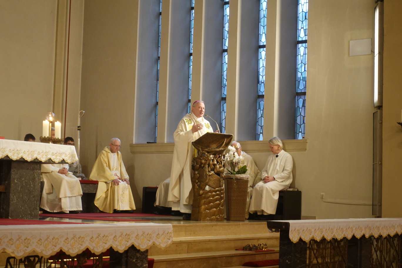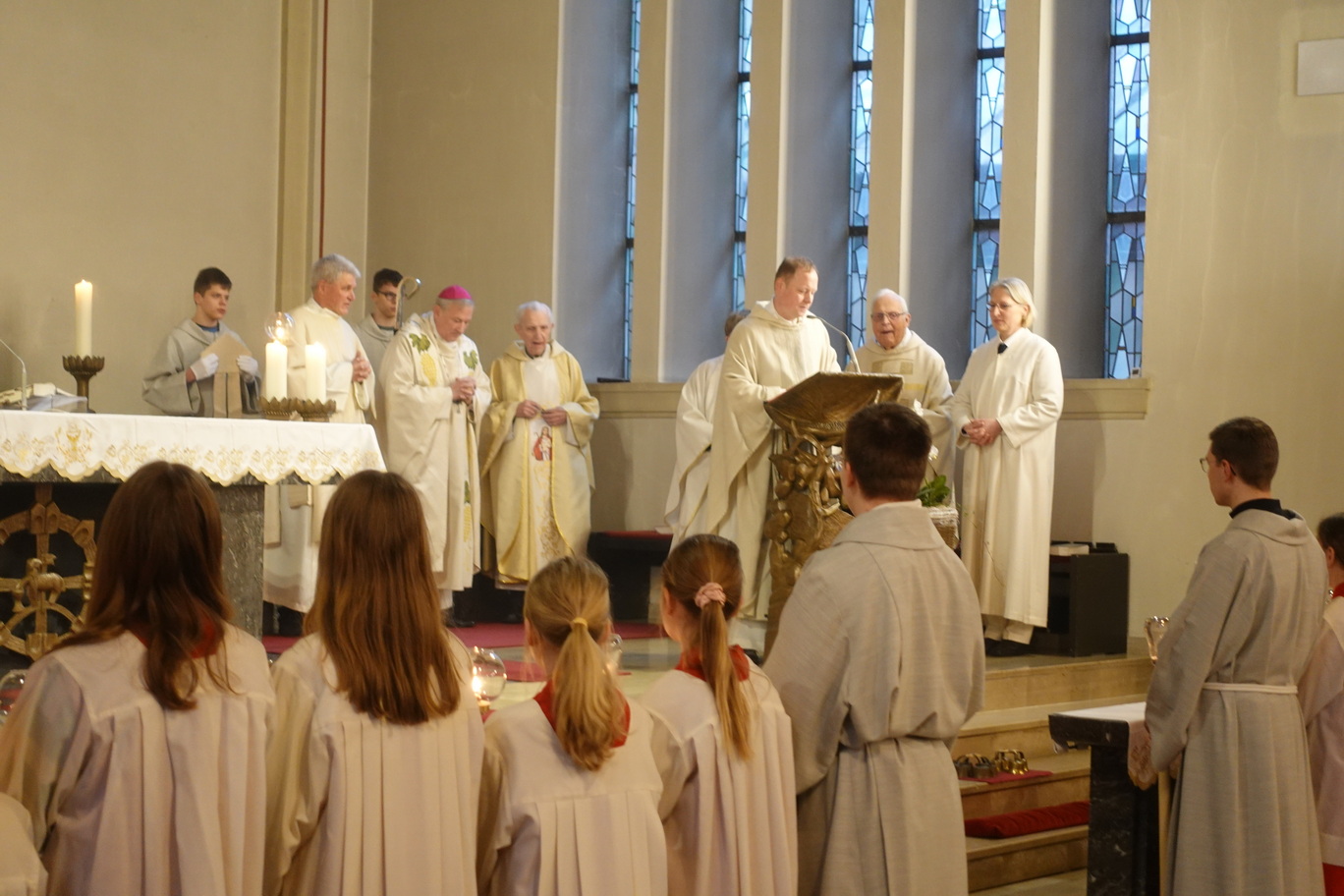 „Dieses Wort bleiben, das ist, glaube ich, kennzeichnend für dein Leben und dein Wirken, lieber Richard,“ predigte der Geistliche. An einem Tag wie diesem, mache das dankbar, „dass wir hier einen Priester erleben, der bei uns bleibt und bei uns ist.“ Büssing habe die Gläubigen immer wieder zusammengeführt. Durch seinen priesterlichen Dienst hätten die Gemeindemitglieder ihre eigene Würde immer wieder erkannt und gesehen. Büssing habe die Gemeinde nicht bevormundet, sondern inspiriert und ermutigt, die Gaben des Geistes zu erkennen und zu leben. „Bleibe noch recht lange bei uns“, wünschte Theising zum Ende der Predigt, die in langem Applaus zu Ehren des Jubilars mündete.