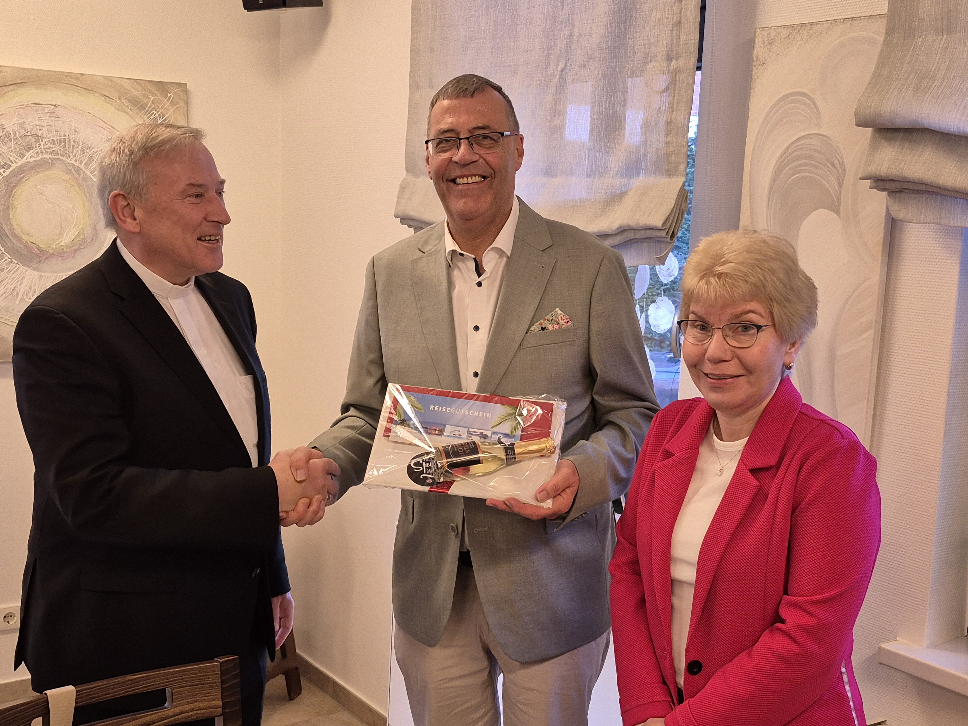 Die Kolleginnen und Kollegen aus der Kirchengemeinde verabschiedeten Andreas Kirsch, der in Begleitung seiner Frau die Sakristei ein letztes Mal offiziell verlies, mit einem Spalier aus Rosen. Beim gemeinsamen Frühstück in der Manufaktur überreichte Weihbischof Theising für die Kirchengemeinde einen Reisegutschein als Dankeschön an Andreas Kirsch.